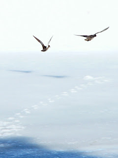 ガンカモ目ガンカモ科 カルガモの飛翔 初級編 omasa 2009年3月4日 先日から親鳥が付きっ切りで、飛翔特訓中のカルガモ。おまさもちょうど飛翔の写真を練習中なので、これ幸いとパシャパシャ! まだ青空をバックに飛ぶことができないコガモです。精一杯の低空飛行が、 いじらしい ♪ お天気のよい日は、 撮影には絶好のチャンス!カモの影が、凍りついた池の上にも並びます。