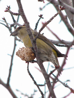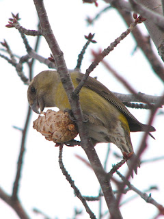 食い違ったくちばしのイスカは珍しい鳥ですね。マツボックリの実を上手に食べてるけど、まるでバードケーキみたい!