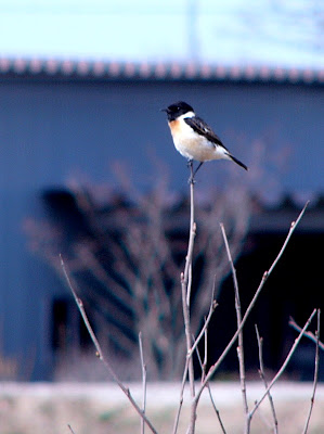 民家をバックのノビタキ君も、黒い頭に、黒い目がキチット撮れていましたよ・・