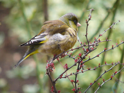 カワラヒワは、なんでそんなとこに止まってるんでしょうね? 若芽でも食べる?