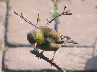 ブルーベリーに止まったカワラヒワ。