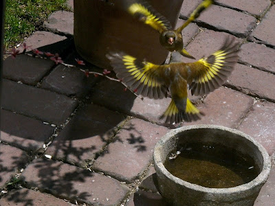 スズメ目アトリ科 カワラヒワ omasa 2009年5月9日 早春の餌が少ない時期は、野鳥に餌をやっても大丈夫だろうと 庭にヒマワリの種を置いていました。 おかげで、近くで野鳥を眺めることができ、 求愛給餌をする姿や餌をめぐるバトルシーンにも遭遇しました。 (自宅 庭) とりゃあ~! とう!羽ばたいて、威嚇し合うカワラヒワ。羽を広げてると、翼に黄色い線が出て綺麗。