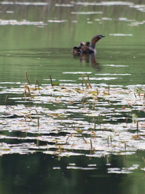 遠過ぎて豆粒のようなカイツブリの母子です。