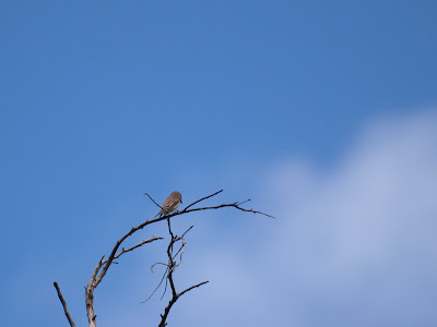澄み切った青空を背景に写っているのは、エゾビタキ。