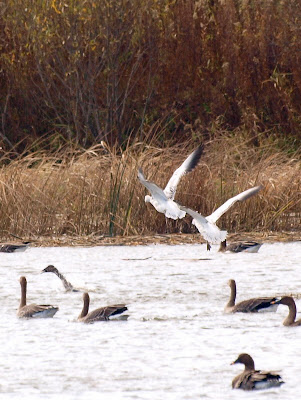 沼でバシャバシャやっているヒシクイに混じって2羽の白い水鳥を発見。でも遠くて、見間違いかも‥と自信ゼロでした。