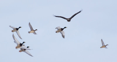 ワシの狩りの場面は私も何度か遭遇しましたが、逃げ惑うカモ達とワシを1コマに撮れた事はありません。