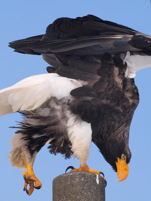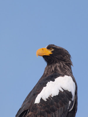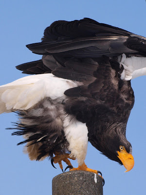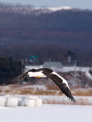 ワシタカ目ワシタカ科 オオワシ omasa 2010年2月4日 再びオオワシです。先日、やはり長都沼近くで見つけました。 おぉ~、何度見てもかっこいい。 のびをした後のポーズです。 片足でも、この安定感。バランス感覚10・0! 逞しい足に鋭い爪‥そして庶民的なモモヒキ姿。あ~、また好きになっちゃいそうだ。 キリッ! 凛々しい。 飛び立った後の後ろ姿。ピントはまずまずだったけれど、ロケーションが残念。 ロケーションはまずまずだったけれど、ピントが残念。上手くいかないなぁ~。 こうして課題は、なおも続くのでありました。