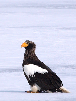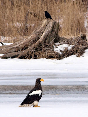 でも、切り株の上のカラス と氷上のオオワシなんてちょっと面白いかも ♪