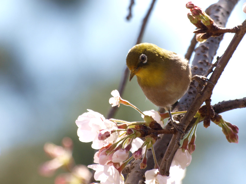 桜の下でしばらく待っていると、必ずと言っていいほどメジロがやって来ます。