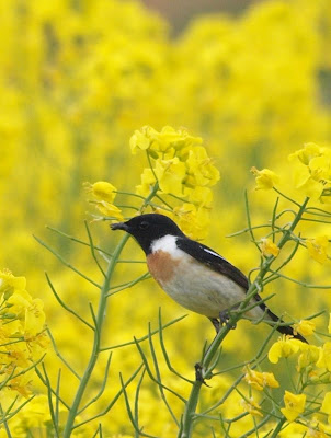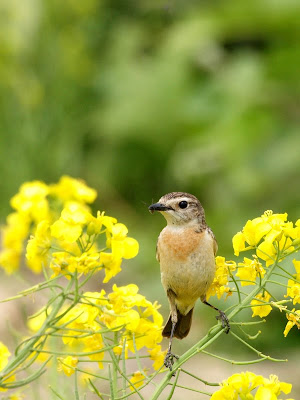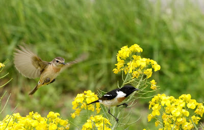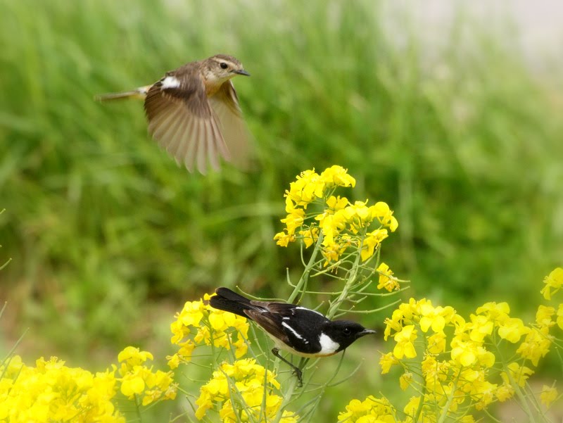 ノビタキの2ショット、菜の花をバックに決まりましたね。