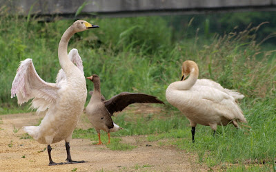 マガンのちびっこがピッタリと傷ついたハクチョウについていく様も、