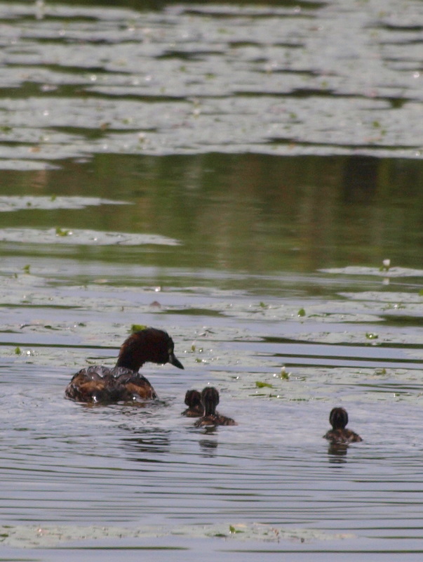 そうこうしていたら ちょうど反対側の沼岸に網を持った子供達がやって来て、親鳥は警戒の鳴き声を上げたあと 雛3羽を背中に乗せてこちらに近づいて来ました。ラッキー ♪