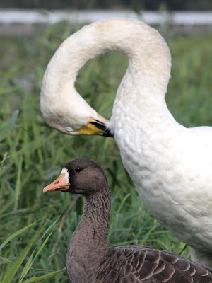 水路のマガンは、ハクチョウから一時も離れません。