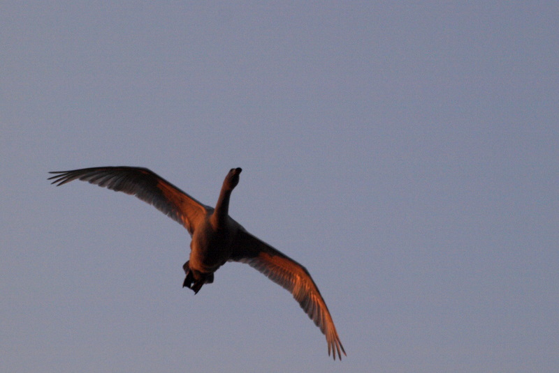 明るくなった沼の上を低空飛行するオオハクチョウ。
