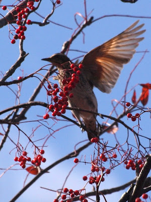 スズメ目ツグミ科 ツグミがやって来た omasa 2010年11月14日 ナナカマドの実が真っ赤です。 鳥見を始めてからというもの こういう実を見ると、 「キレイ」というより「美味しそう」と思うようになってしまいました。 このところ、ツグミをよく見かけるようになりました。 美味しそうなこの赤い実を求めて、ツグミ達がやって来ます。 羽が透けてキレイ‥。 北から南下してきて間がないのでしょうか。今は大概が群れになって行動しています。 後から来るキレンジャクにも、ナナカマドの実を少し残しておいてね。思わずそうお願いしたくなるような、見事な食べっぷりでした。 撮影 11/13 恵み野中央公園