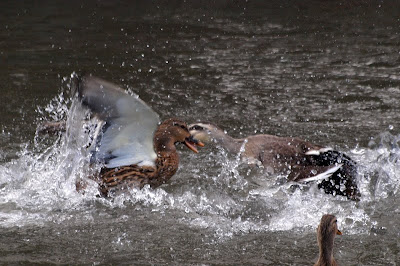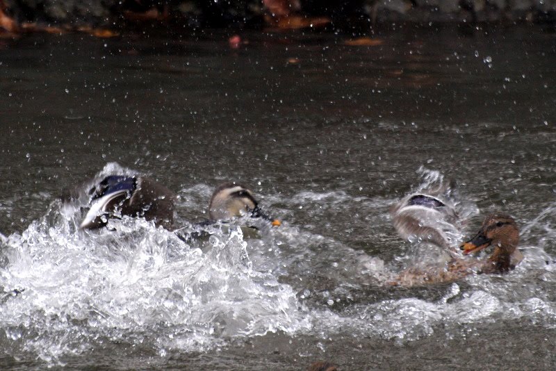 マガモとカルガモの壮絶なバトル、カルガモは雄雌の区別は判りませんが、きっと雌同士なんでしょうね・・女性は恐いですからね!