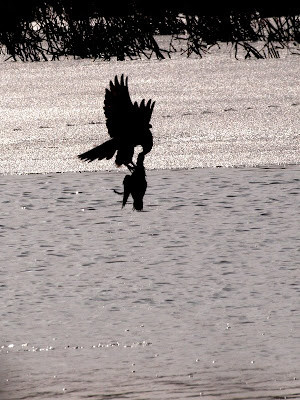 タカ目ハヤブサ科 ハヤブサ omasa 2010年12月21日 午後から良いお天気になったので、ふらっと長都沼に行って来ました。先日は殆ど結氷していましたが、このところの暖かさで氷がいくぶん解け沼はマガモ達で賑わっていました。 ‥と、突然マガモ達が飛び立ち‥ 1羽の猛禽が現れました。 ハヤブサです。 何度か旋回したと思ったら 、次の瞬間には水鳥を捕らえていました。 逆光でシルエットだけになってしまいましたが、獲物の首を両足でがっしりと掴んでいるのが分かります。 空中で獲物をしとめているようにも見えます。 ついほんの数秒前まで、沼を泳いでいた水鳥(多分カモの仲間)は‥ ぐったり‥ 滴り落ちる水滴が哀れです。 でも、命はつながっているから‥ 撮影 12/21 長都沼