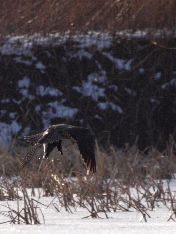 タカ目ハヤブサ科 ハヤブサ omasa 2010年12月21日 午後から良いお天気になったので、ふらっと長都沼に行って来ました。先日は殆ど結氷していましたが、このところの暖かさで氷がいくぶん解け沼はマガモ達で賑わっていました。 ‥と、突然マガモ達が飛び立ち‥ 1羽の猛禽が現れました。 ハヤブサです。 何度か旋回したと思ったら 、次の瞬間には水鳥を捕らえていました。 逆光でシルエットだけになってしまいましたが、獲物の首を両足でがっしりと掴んでいるのが分かります。 空中で獲物をしとめているようにも見えます。 ついほんの数秒前まで、沼を泳いでいた水鳥(多分カモの仲間)は‥ ぐったり‥ 滴り落ちる水滴が哀れです。 でも、命はつながっているから‥ 撮影 12/21 長都沼