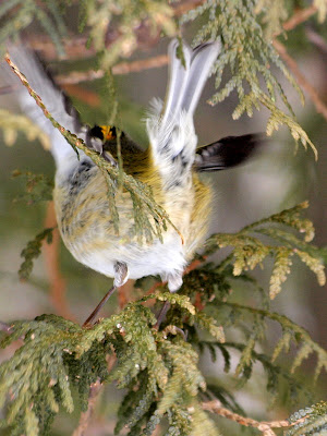 やっと正面を向いてくれたキクイタダキの黄色の帽子、カワイイですね。 いつの日か私も見てみたいです
