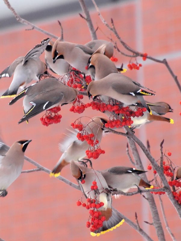 私は、2日前に3時間ほどキレンジャクを探しナナカマドのある所の市内を車でうろうろ・・でも、見つからず諦めて家に戻る途中、家のすぐ側のナナカマドにキレンジャクでなくヒレンジャク20羽程がツグミと一緒にいる所を撮ることができました。