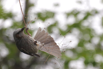 今にも折れそうな細い枝に必死に掴まり懸命に巣材集めに