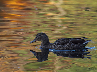 お馴染みのマガモも、水面に映り込んだ秋色で