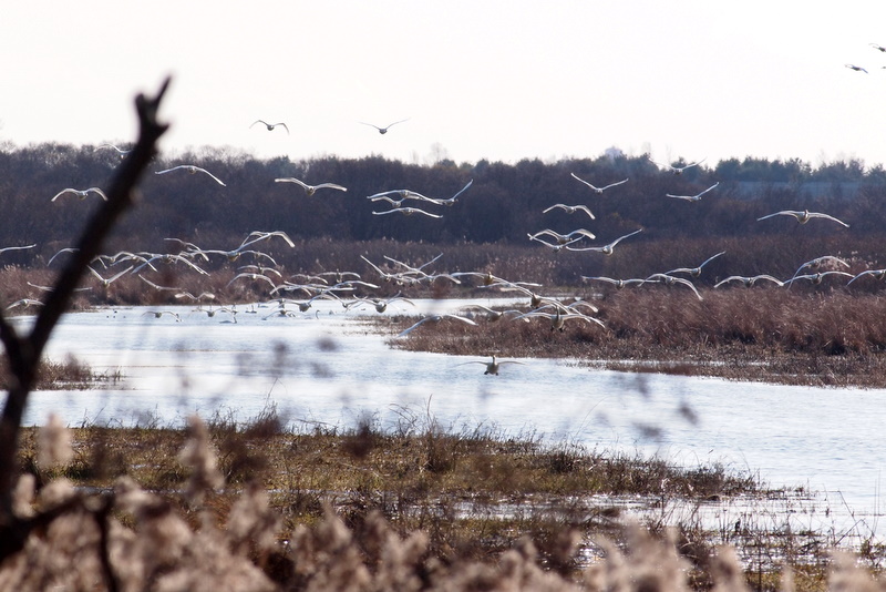 沼にはマガンやヒシクイの群れが羽を休めていましたが、