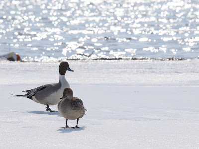 雪の上を懸命に、よちよちと歩くオナガガモ。