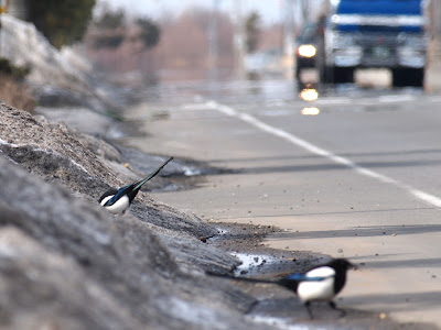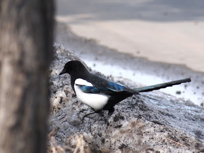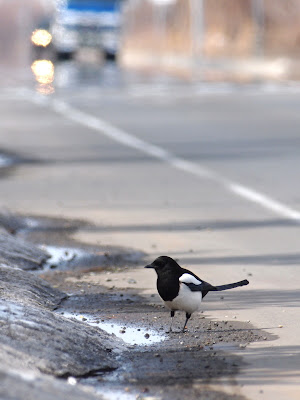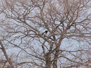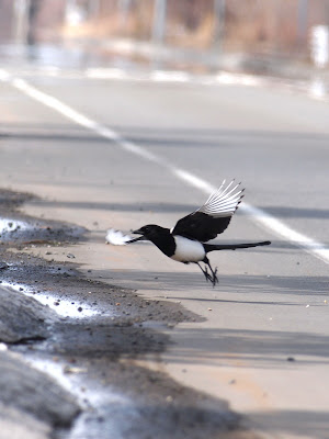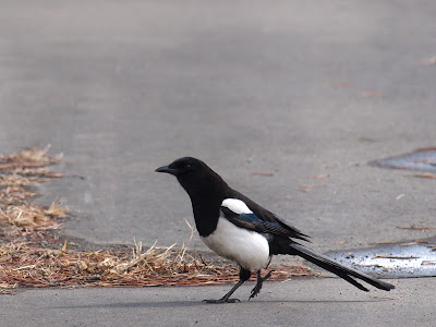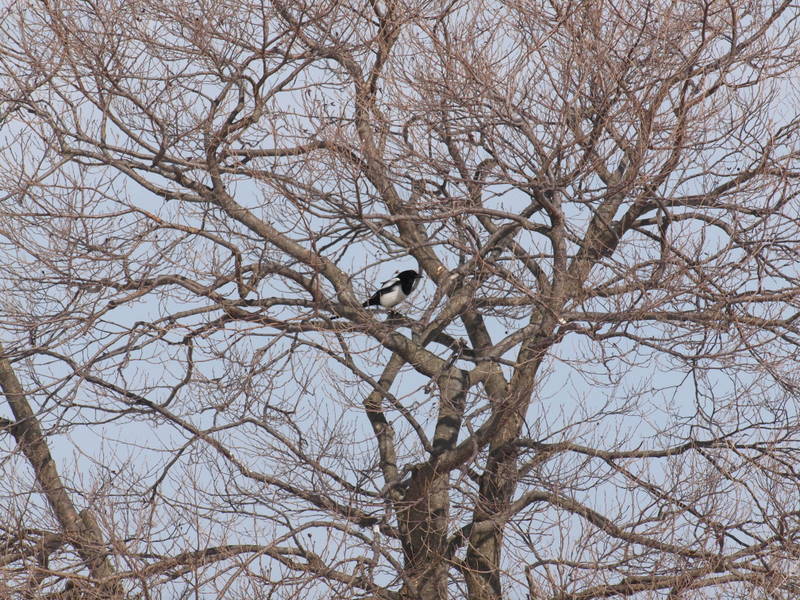 少し離れた道の反対側の木に、ソフトランディングしたカササギ。