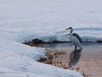仲良く並んでいるのは、ダイサギとアオサギ。