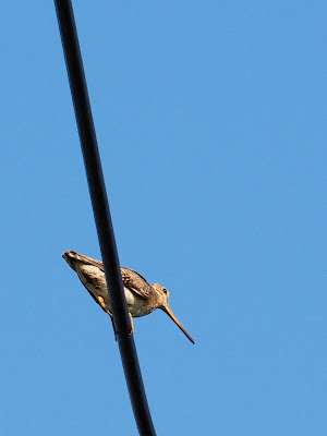 もう1羽のオオジシギが幼鳥のそばの電線にとまった。