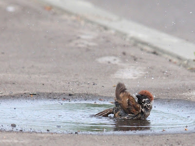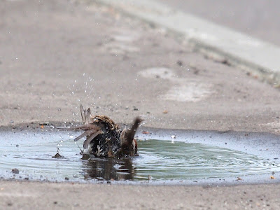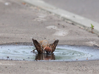ずぶ濡れのスズメは、またバシャバシャバシャとやり始めました。