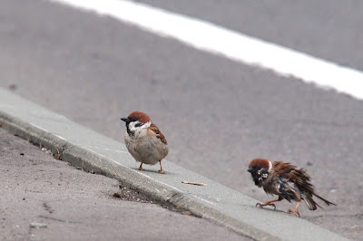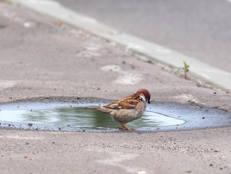先に水浴びをしていたスズメが、さっとその場を離れて行きました。