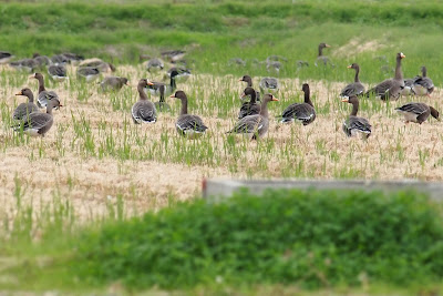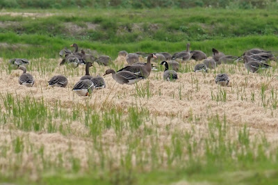 沼の近くの畑では、マガンが餌をついばんでいました。