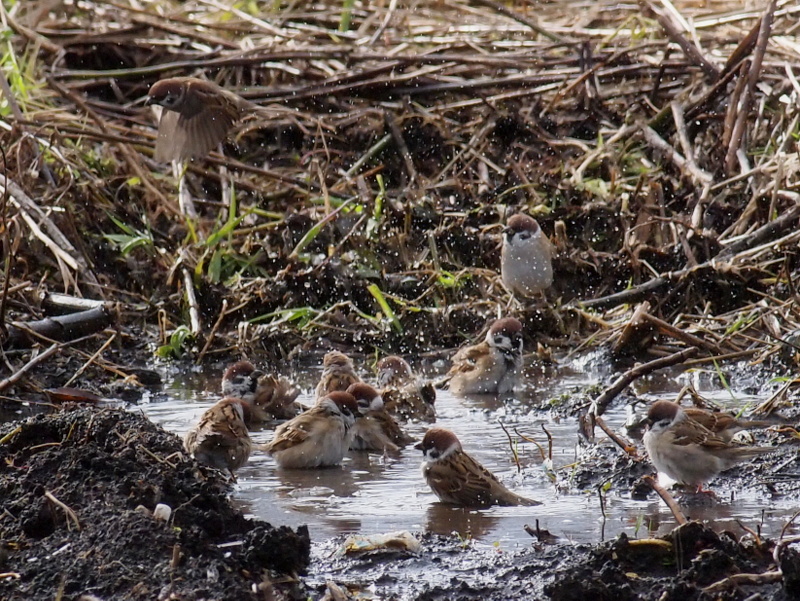 帰り道、スズメが水浴びをしているところに出くわしました。