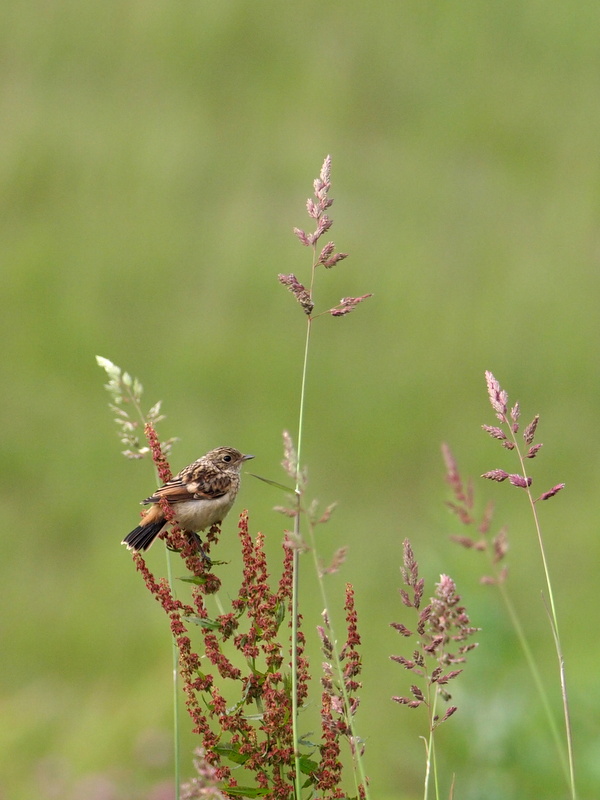 遠くのヨモギに、ノビタキのヒナが2羽とまっていました。