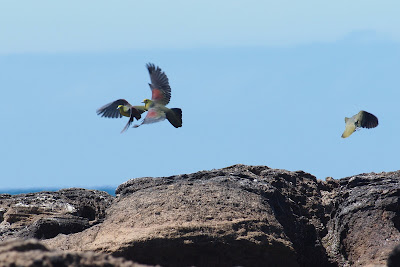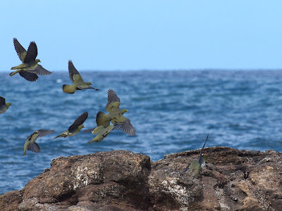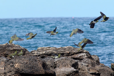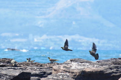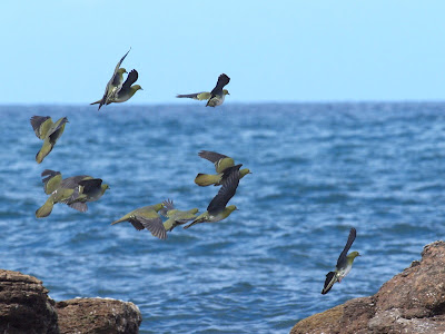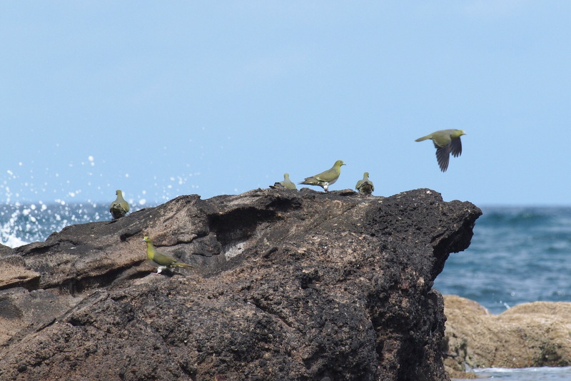 海を背景に飛ぶ 緑色をしたハトの美しいこと。