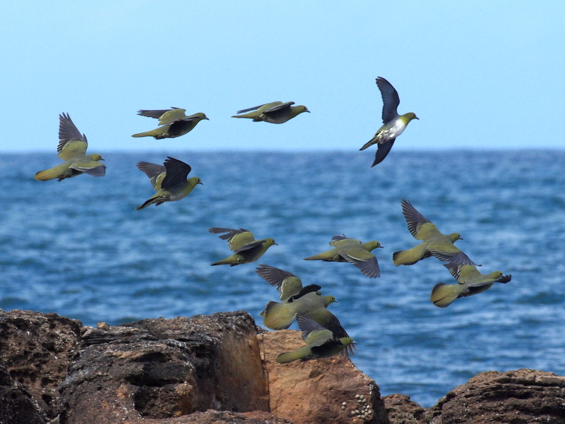 海を背景に飛ぶ 緑色をしたハトの美しいこと。