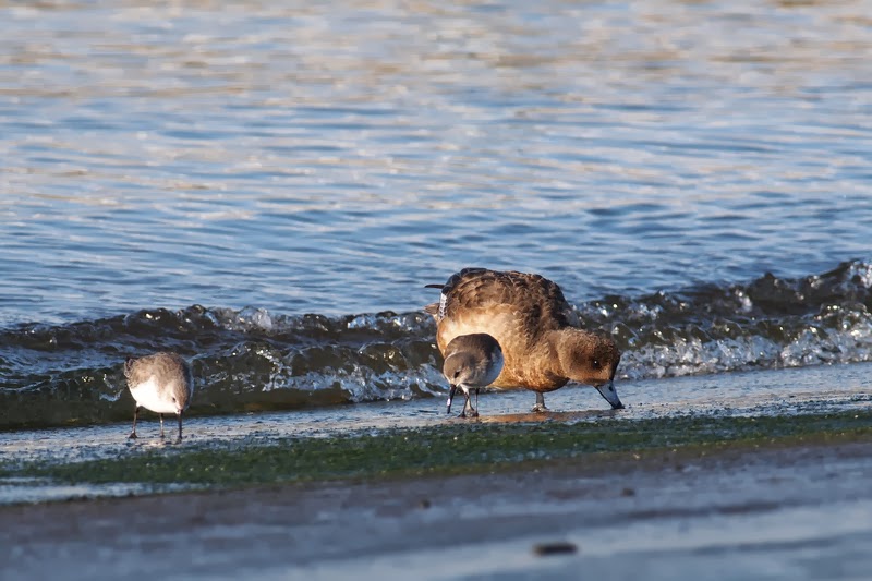 ヒドリガモと一緒にいるシギは、ハマシギです。
