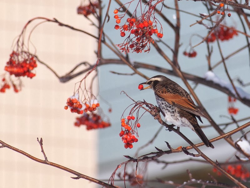 スズメ目ヒタキ科 ツグミ omasa 2014年2月9日 先月の中旬から下旬にかけては、人気の少ない場所で見かけることの多かったツグミ。 このところ市街地の街路樹に群がるようになりました。 イチイの中に、まだ くちばしの黄色いツグミを見つけました。 不思議そうにこちらを見返しています。 ちょっとだけ写真を撮らせてね。 臆病者のツグミ。 いつもはすぐに逃げちゃうけれど、 お食事中はちょっぴり大胆です。 遠慮なく召し上がれ。 ナナカマドの実、まだたくさん残っているから。 撮影日 2014/2/8撮影場所 恵庭市